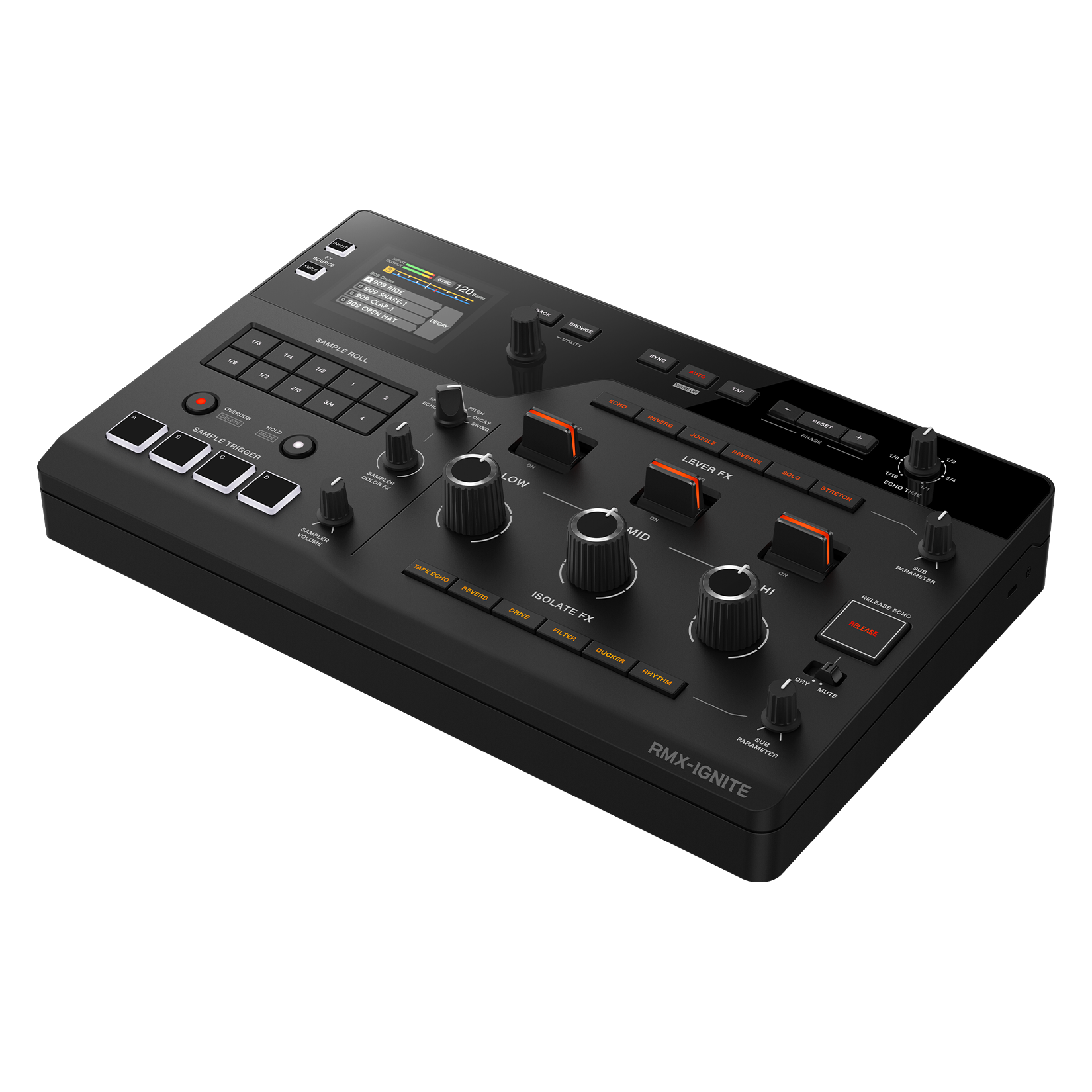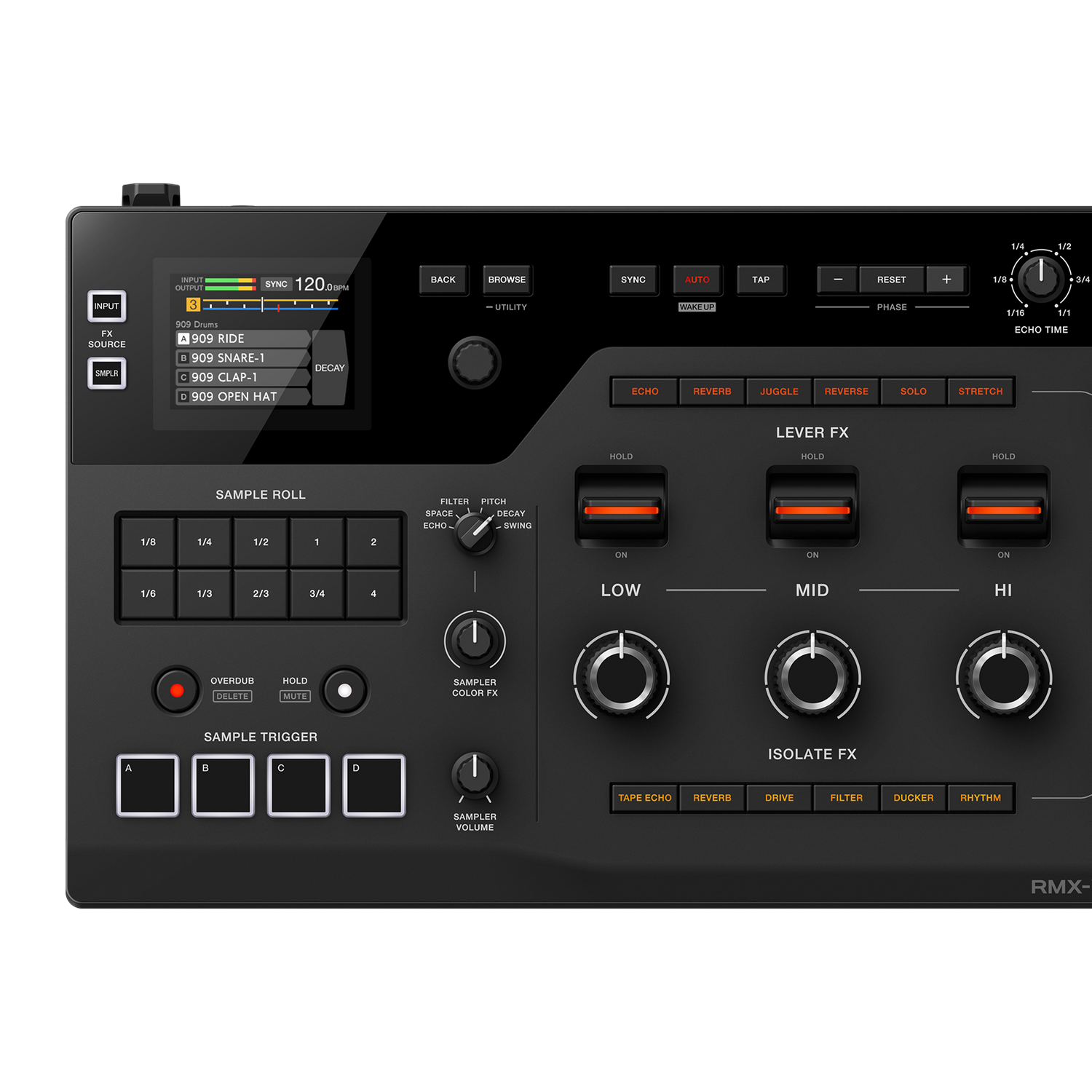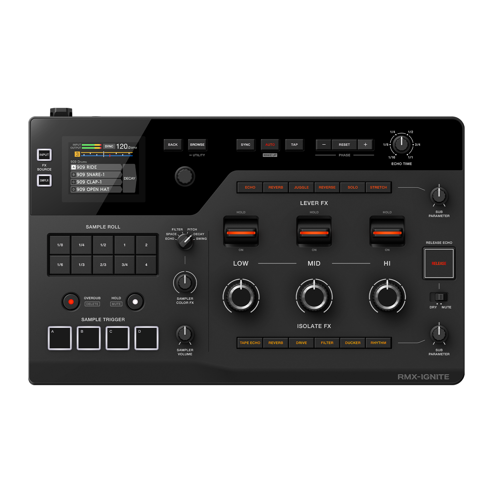 Use the 3 large levers to apply instant, dramatic effects: Echo, Reverb, Juggle, Reverse, Solo, and Stretch.
