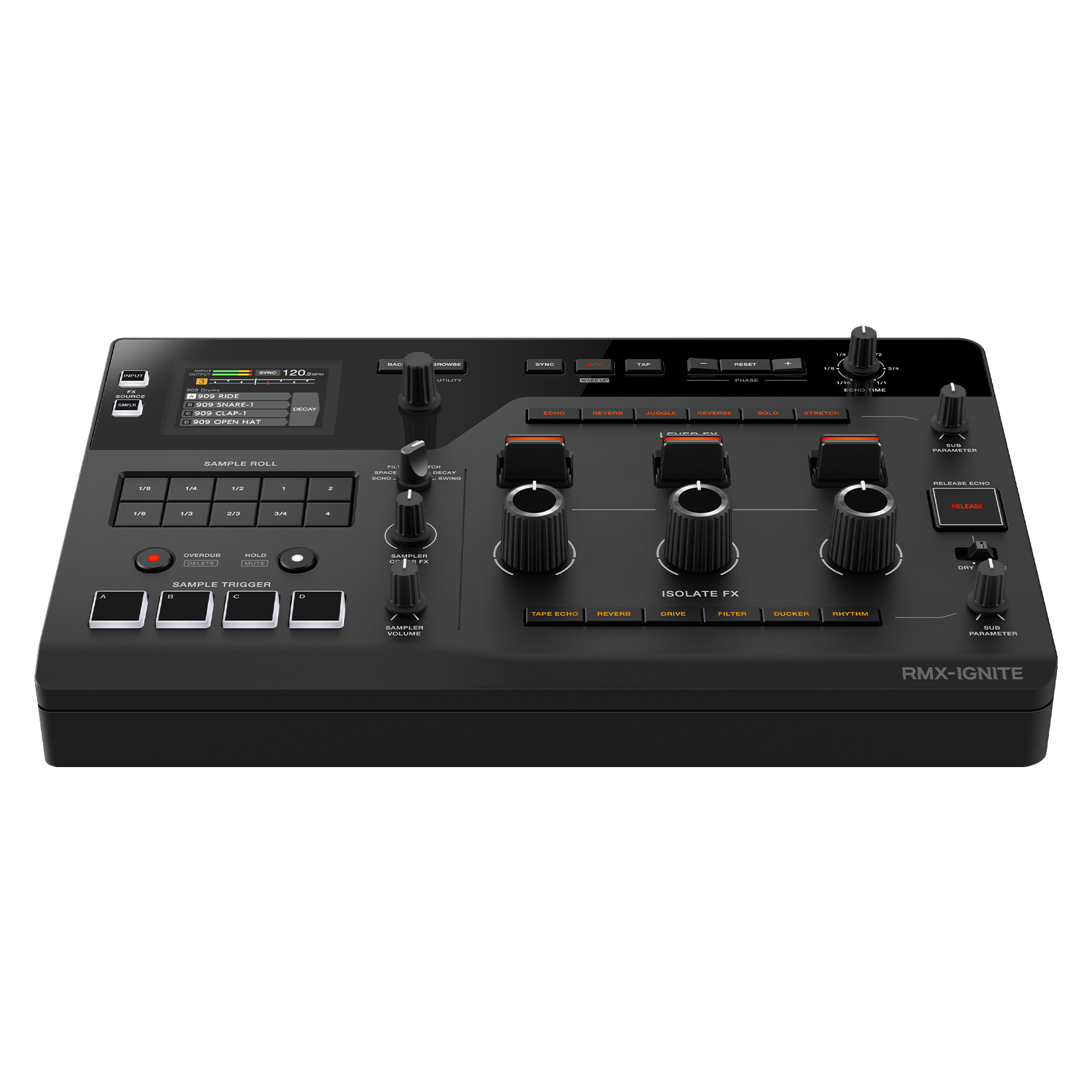 3 large knobs enable smooth and dynamic control of Tape Echo, Reverb, Drive, Filter, Ducker, and Rhythm.
